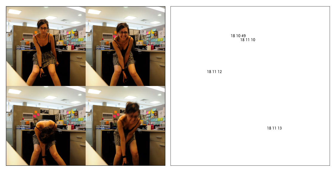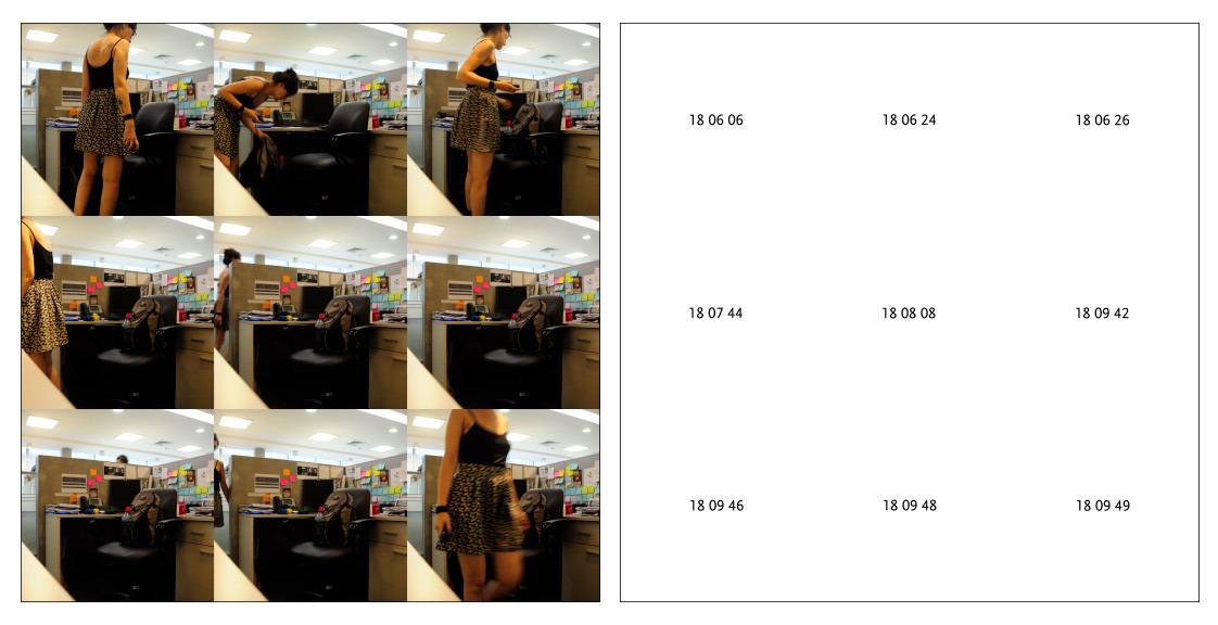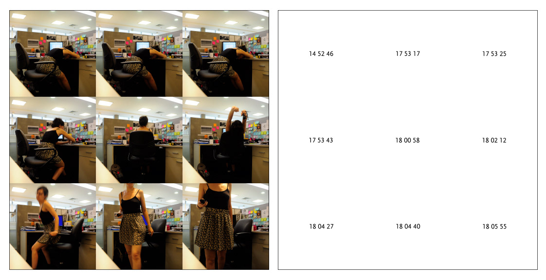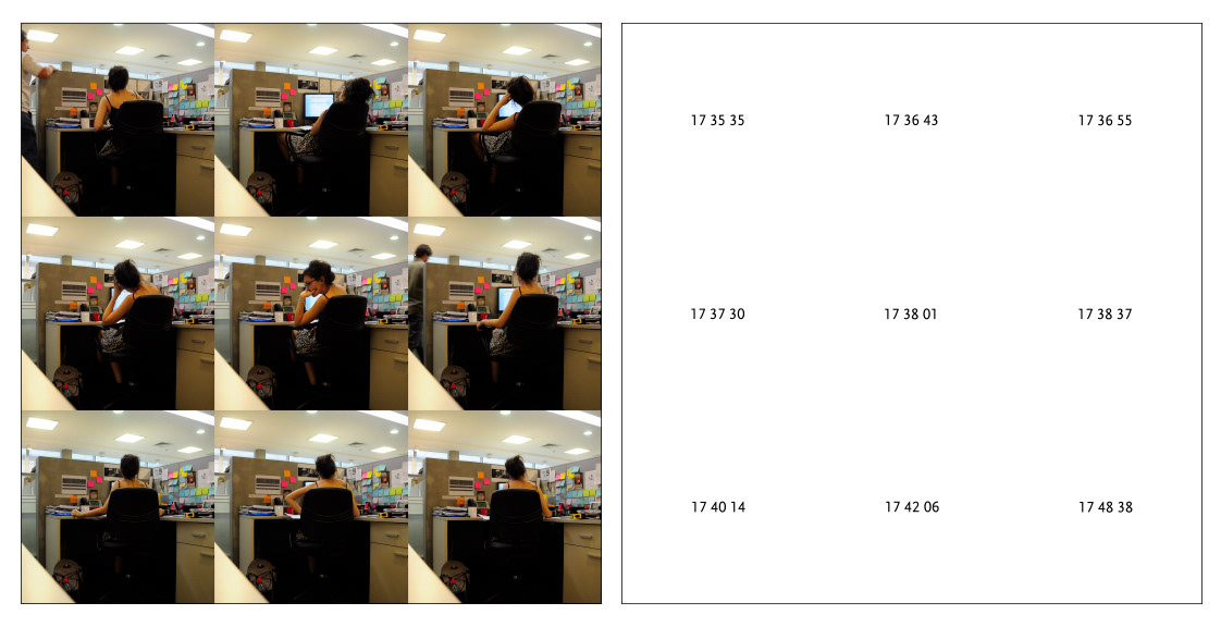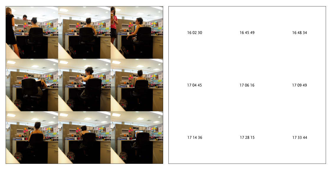 Performance realizada en un día laboral normal dentro de mi espacio diario de trabajo. Durante toda la jornada disparé de forma inalámbrica mi cámara cada vez que me encontraba abrumada por la rutina sintiendo que ese no era mi lugar. La secuencia completa de 65 fotografías cuadradas están distribuidas en 6 paneles (cantidad de lados de un dado) con 9 fotografías en cada panel, y un séptimo panel con las últimas 4 donde la jornada laboral ya finalizó y lo único que queda por hacer es ir a casa. En paralelo las anotaciones del tiempo de cada disparo, y en este último panel de manera más libre, sin separación, ni puntuación, sino una suerte de aire producto de sucesivos respiros interconectados.